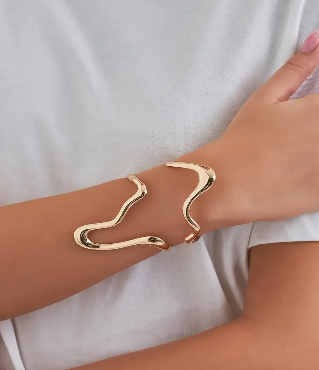 Der Armreif – Asymmetrical Catch schimmert goldfarben und hat eine asymmetrische Form. Der Statement-Armreif lässt sich toll mit weiterem goldfarbenem Schmuck kombinieren!